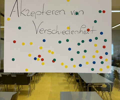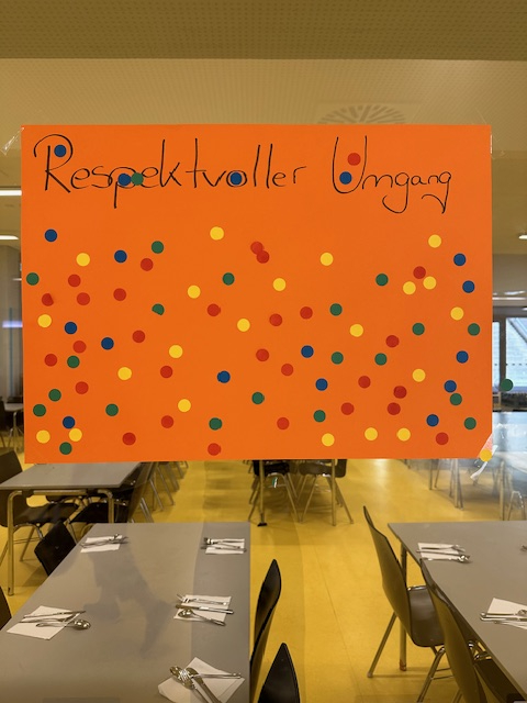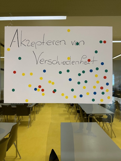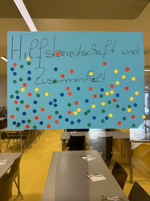 Nachdem das letzte Schuljahr mit einer gemeinsamen Abschlussaktion samt Drohnenfoto auf dem Sportplatz beendet wurde, haben sich Schülerinnen und Schüler sowie Lehrkräfte in der ersten Schulwoche im Innenhof des Gymnasiums zusammengefunden, um auch das neue Schuljahr wieder zusammen zu beginnen. OStD Andreas Schaller nutzte die Gelegenheit, um sich der Schulgemeinschaft vorzustellen, und betonte, wie sehr er sich auf seine neue Aufgabe und ein gutes Miteinander freue. Darum ging es auch in den anschließenden Aktionen: Die Schülerinnen und Schüler stimmten darüber ab, welcher Wert ihnen in diesem Schuljahr besonders wichtig ist. Außerdem formulierten sie ihre persönlichen Ziele und überlegten, was sie selbst zu einem guten schulischen Zusammenleben beitragen können.